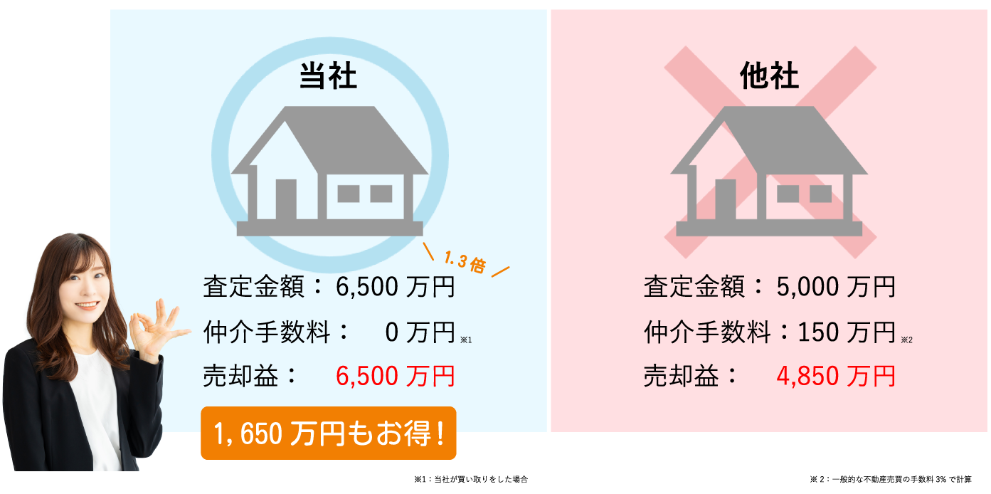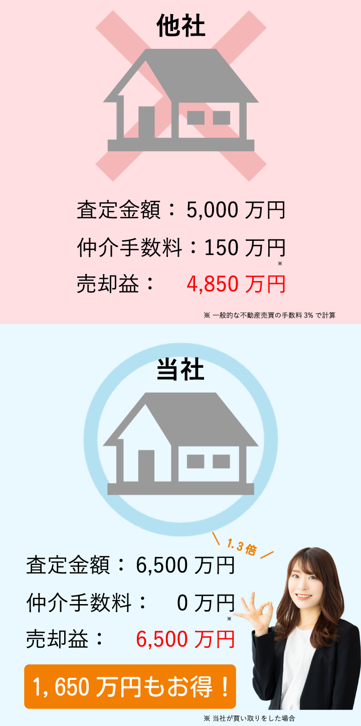 しかし、当社がお客様の相続不動産を直接買い取った場合、仲介手数料が不要なため、単純に3%お得になります。
