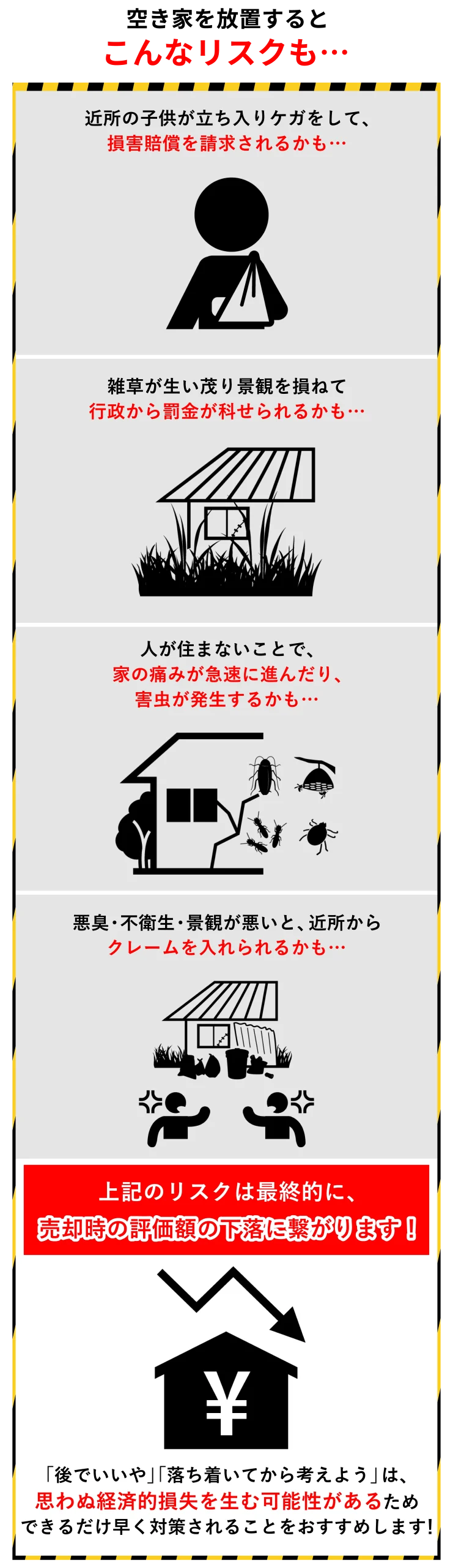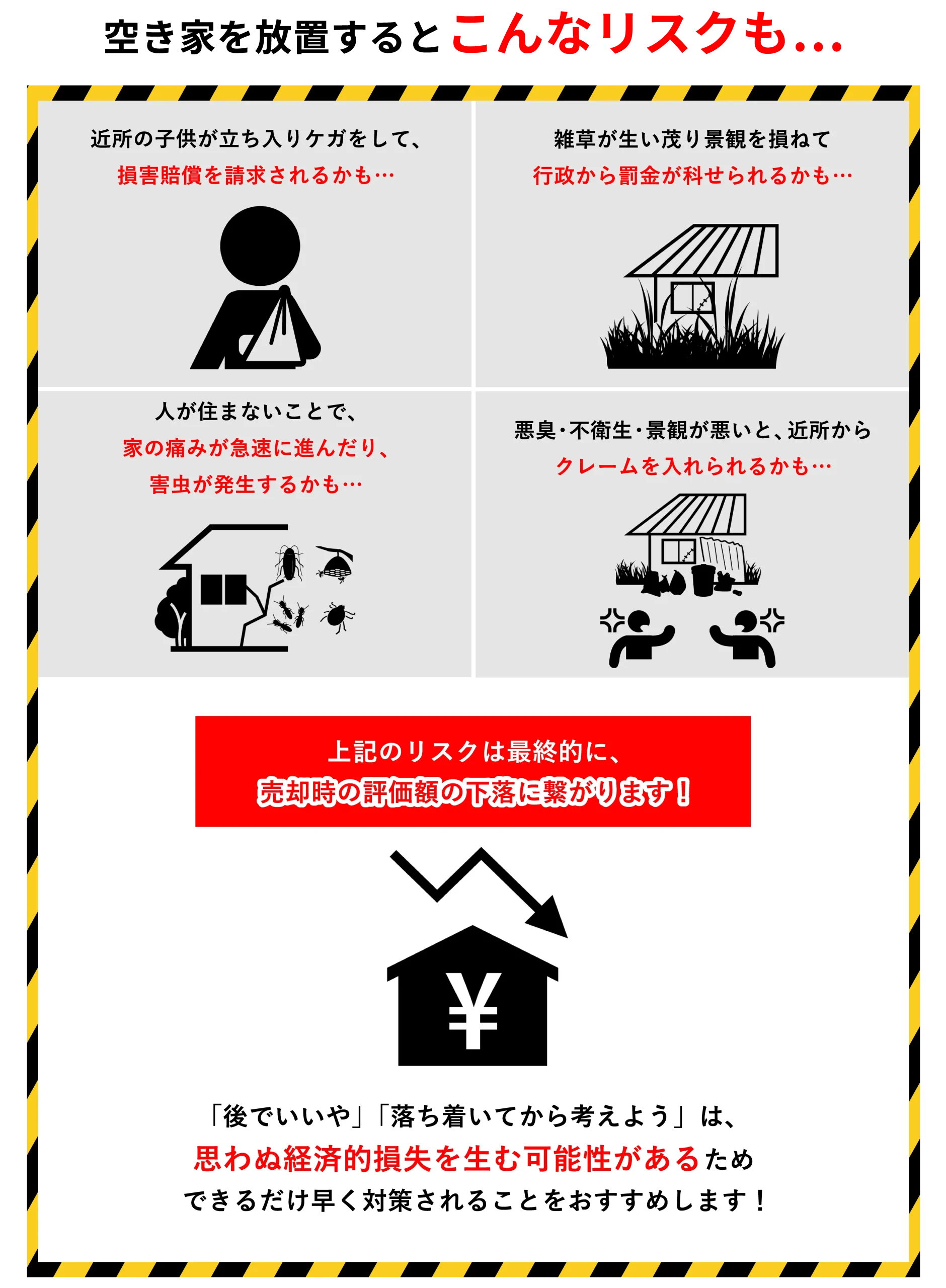 これらの状態で空き家のまま放置することは「百害あって一利なし」のため、早急な対処が必要です。